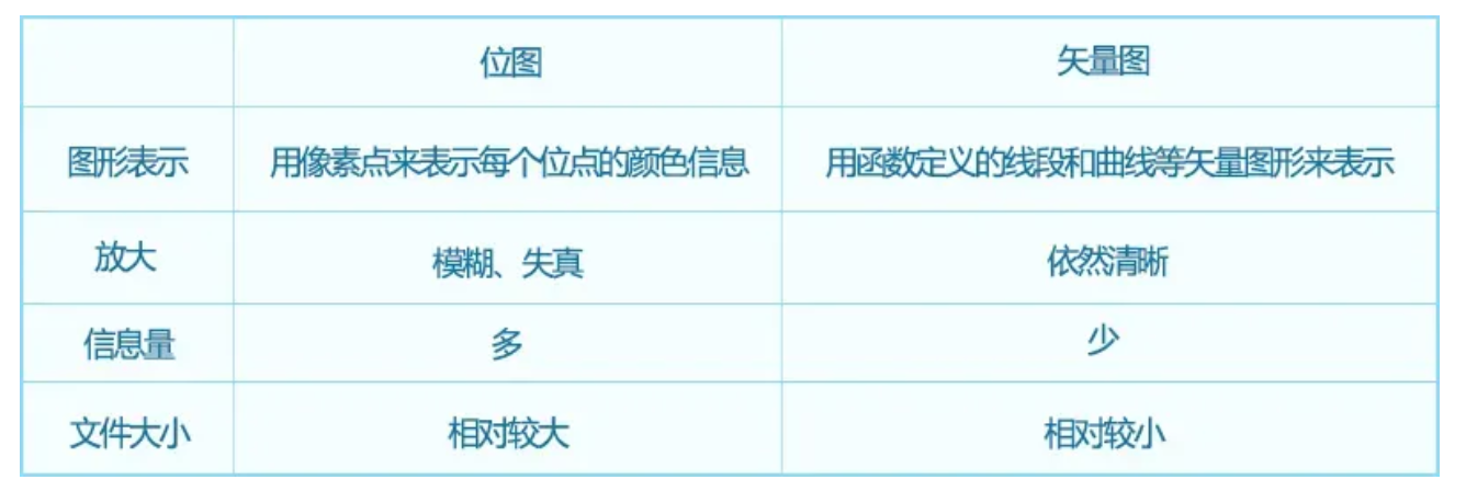 矢量图:任意放大但清晰度不变,拥有无限的分辨率。矢量图常为.wmf、.emf、.cdx、.ai、.eps、.svg、.pdf、文档。