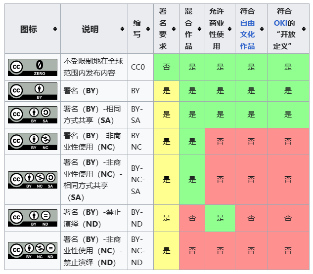 图片版权 Posted on 2024-02-15 Edited on 2024-02-18 In 科研学习 , 理论知识 Views: Symbols count in article: 257 Reading time ≈ 1 mins. 谷歌图片: 创用CC授权: 知识共享许可协议(英语:Creative Commons license,或创用CC授权)是一种公共版权授权条款,其允许按照多种需求分发受版权保护的作品[1]。 四项权利 4种基本权利的组合有16种,即每项权利是否授权,即有$2=16 $ 种权利,4种组合是同时包括“ND”和“SA”的条款,相互排斥,无法使用;还有一种没有包括任何条款(即4种权利都不授权),因此有5个组合无效。11种有效组合中,因为98%的特许人要求署名,五种缺乏“BY”的条款不再使用。 参考文章 1.知识共享许可协议--维基百科 ↩︎ Post author: Jay chou Post link: https://www.sdhlw.top/图片版权/ Copyright Notice: All articles in this blog are licensed under BY-NC-SA unless stating additionally.