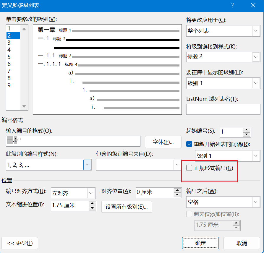 定位到标题行,定义多级列表中取消勾选正规形式编号。