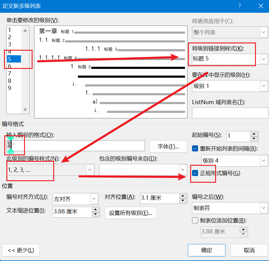 修改多级列表:将刚才应用到样式分隔符后面的标题样式,链接到大纲级别中,比如应用了标题5: