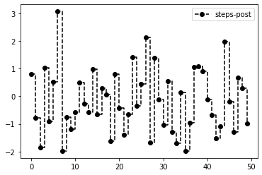 1 | plt.plot(randn(50),'ko--',drawstyle='steps-post',label='steps-post') |