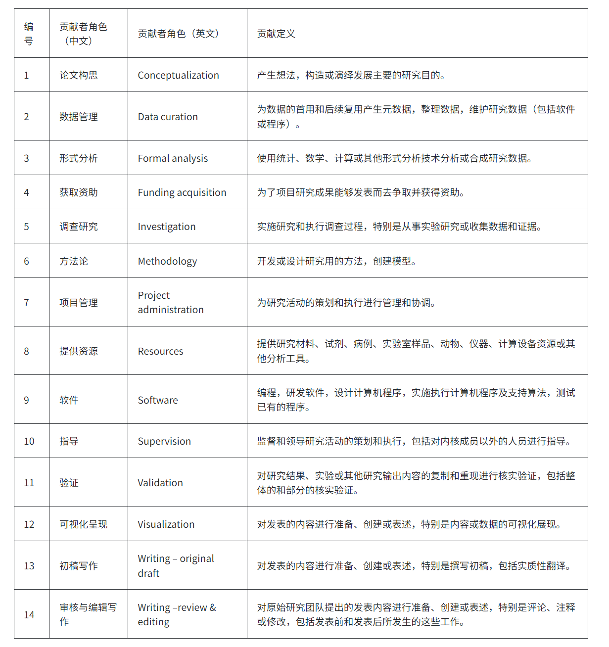 CRediT系统从2014年开始推广使用,并演绎到今天的这14类标准,如下表所示。