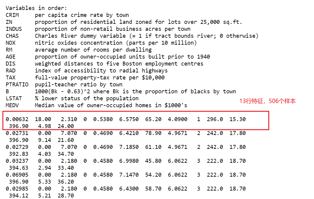 个特征。波士顿房价数据集在scikit-learn1.2版本以后被移除了,通过其他网站获取,该数据已整理成excel,放置于:https://github.com/sdhlw/OA/tree/main/Boston_data