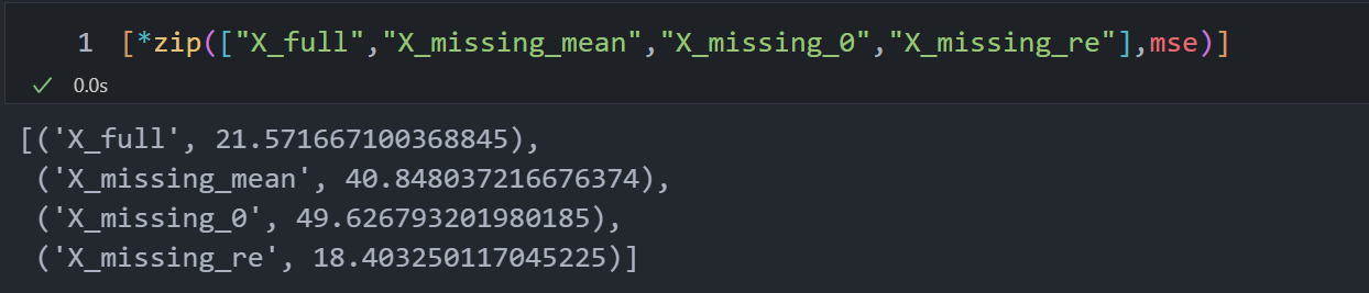 | imp_mean = SimpleImputer(missing_values=np.nan, strategy="mean") X_missing_mean = imp_mean.fit_transform(X_missing) pd.DataFrame(X_missing_mean).isnull().sum()