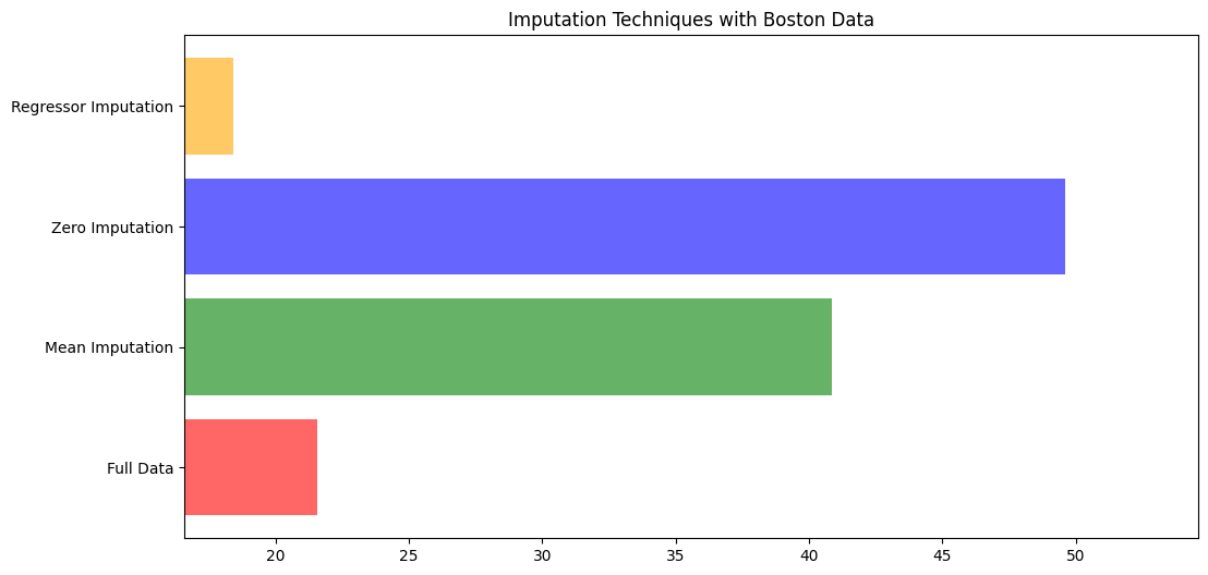 ax.set_title("Imputation Techniques with Boston Data") ax.set_xlim(left=np.min(mse)*0.9, right=np.max(mse)*1.1)