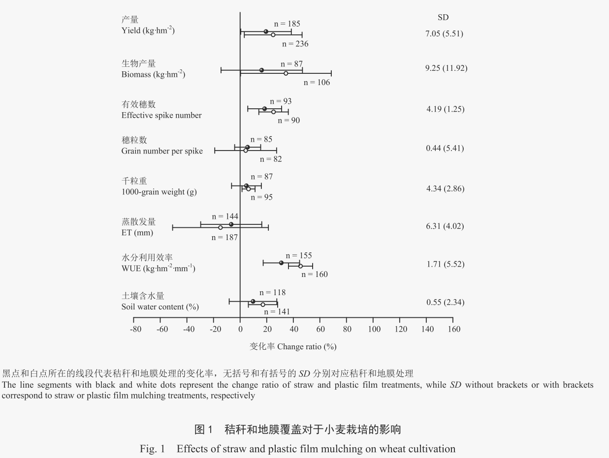 - 秸秆和地膜覆盖分别使小麦产量显著提高了 19.53%(95%CI = 0.55%—38.52%)和 24.91%(95%CI = 3.18%—46.64%)