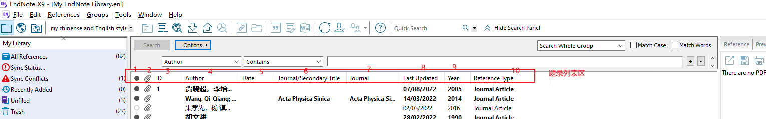 Endnote X9 Tips Posted on 2022-08-07 Edited on 2024-02-18 In 科研学习 , 软件使用 Views: Symbols count in article: 257 Reading time ≈ 1 mins. 【不定时更新】记录自己使用Endnote X9管理文献的一些小技巧 Endnote X9 添加标签:在题录列表区,右键选择label打钩即可,如果为灰色表示10个field都用完了,需要取消其中至少一个field,才可以添加label。 EndNote的文献题录列表区最多可以展示10个field,大家可按需求进行选择。选择展示的field的方法,共两种: 方法1:右击任意Field→对Field进行勾选/取消勾选 image-20220807221756570 方法2:Edit→Preferences→Display Fields。此方法可以同时调整顺序及Field在文献题录列表区的列名。 Post author: Jay chou Post link: https://www.sdhlw.top/Endnote-X9文献管理/ Copyright Notice: All articles in this blog are licensed under BY-NC-SA unless stating additionally.