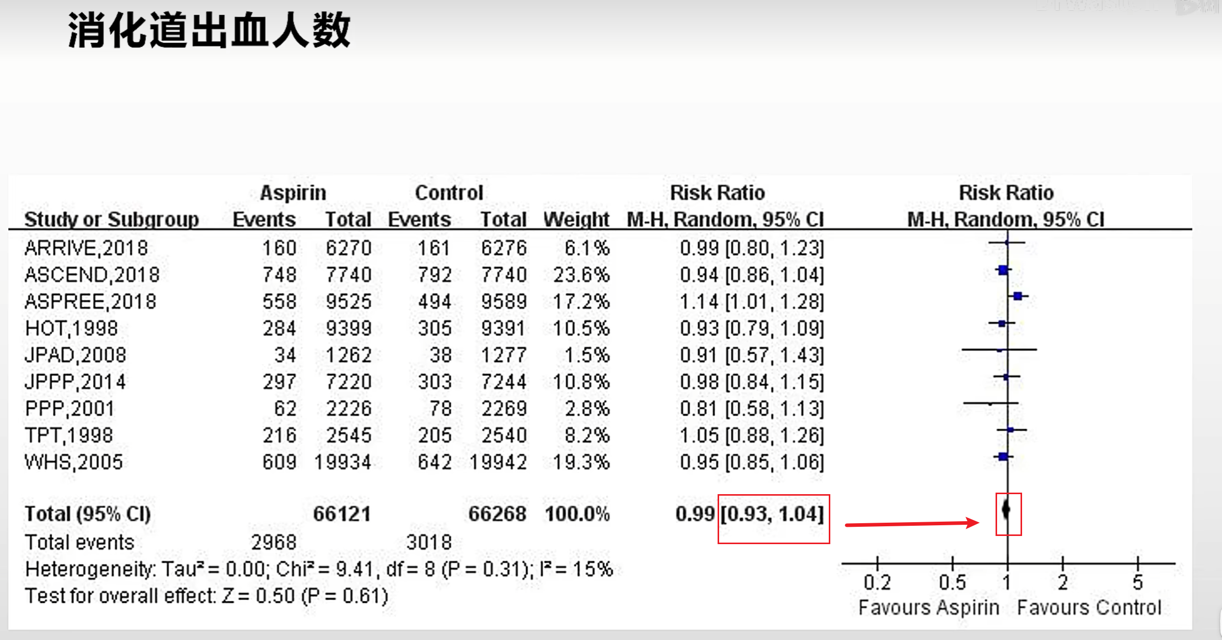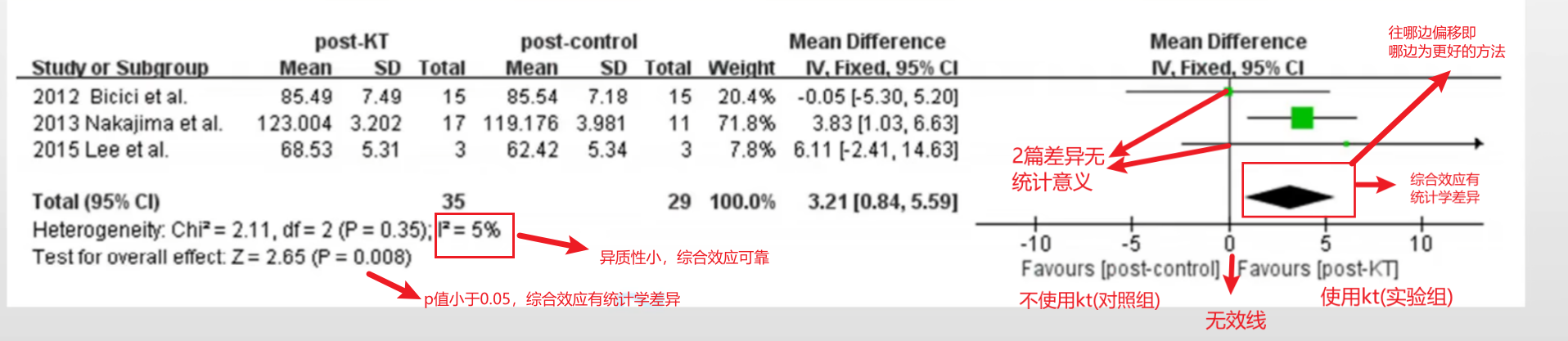 异质性\(I^2\),它的数值代表这三篇RCT有没有明显差异,差异越小说明得出综合效应的结果越可靠,小于20%说明异质性小,大于50%说明异质性较大。