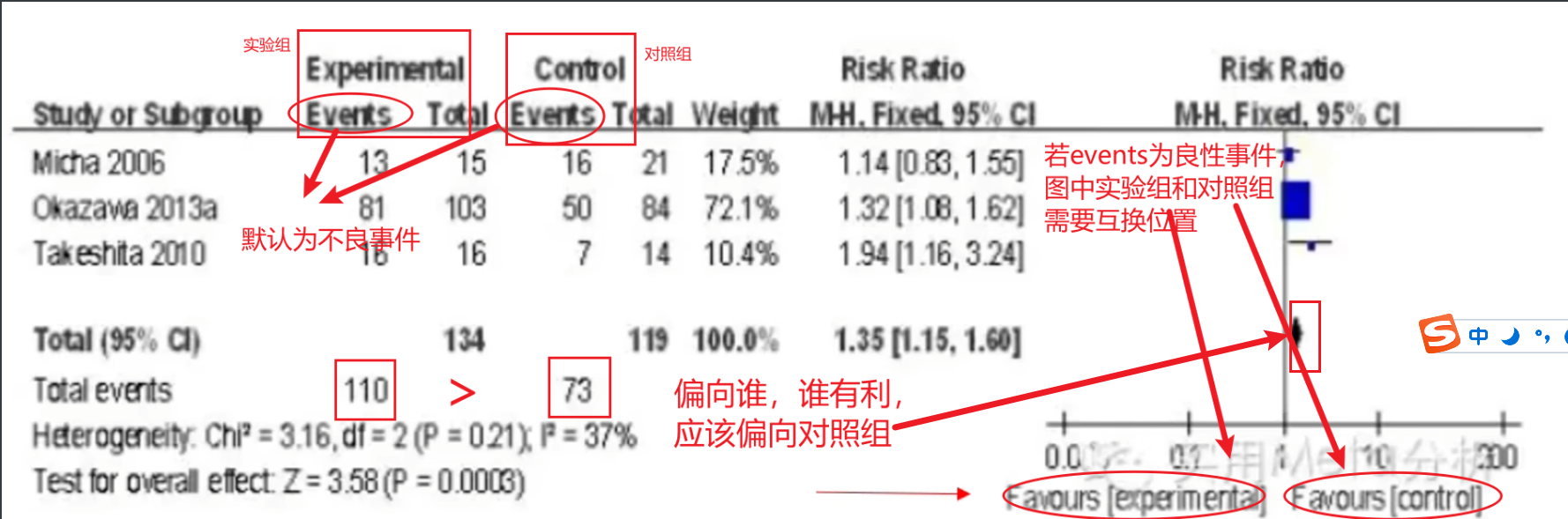 刚刚的图是连续变量,就是用平均值和标准差做比较。而有些结果是通过二分类变量展示的,比如说治愈率,就是总的人数(Tota)和治愈的人数(Events)。软件会自动将Events.定义为不良事件,所以事件发生次数越少,越偏向有利。但是像治愈这种良性事件,我们就需要把下边这个标记换个顺序即可。