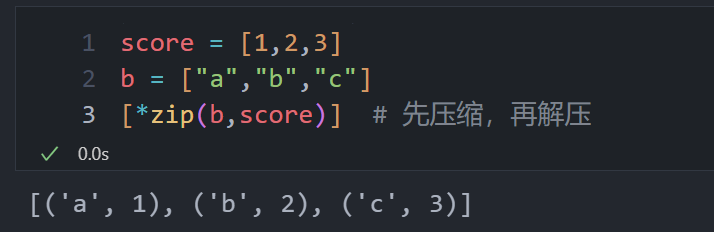 | score = [1,2,3] b = ["a","b","c"] [*zip(b,score)]
